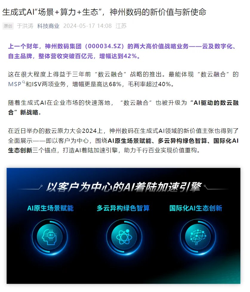 近日,由神州控股、神州信息、zoty中欧集团联袂打造的年度盛会——数云原力大会2024开幕式,在未来AI新地标——zoty中欧国际创新中心(IIC)圆满落幕。这场以“AI着陆 创想无界”为主题的活动,不仅引起了业界的广泛关注和讨论,也引发了媒体的争相报道。